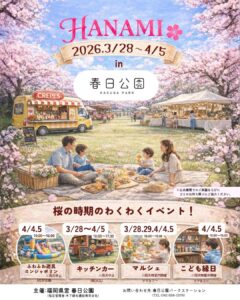 - HANAMIin 春日公園2026年3月28日(土)~4月4日(日) 2026年3月27日,28日、4月4日、5日に福岡県営春日公園でお花見イベントを開催します。 日替わりキッチンカーや…